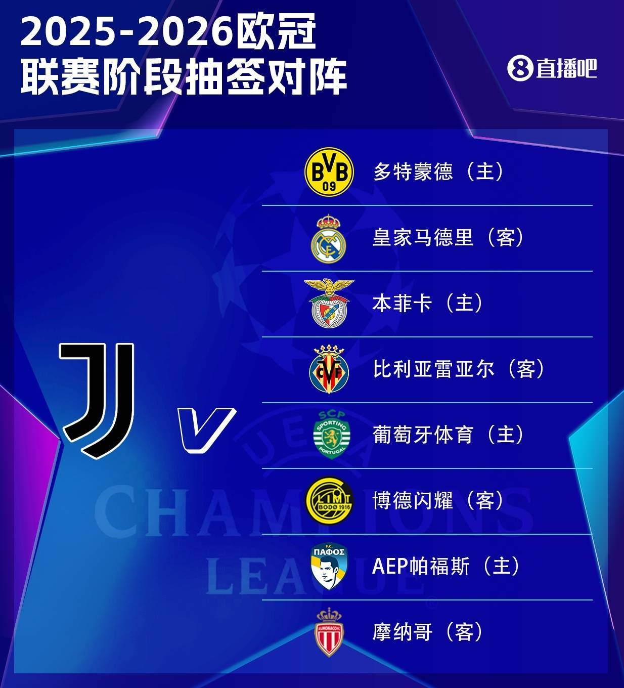 尤文欧冠赛程:首轮战多特,第3轮客战皇马,末轮客战摩纳哥